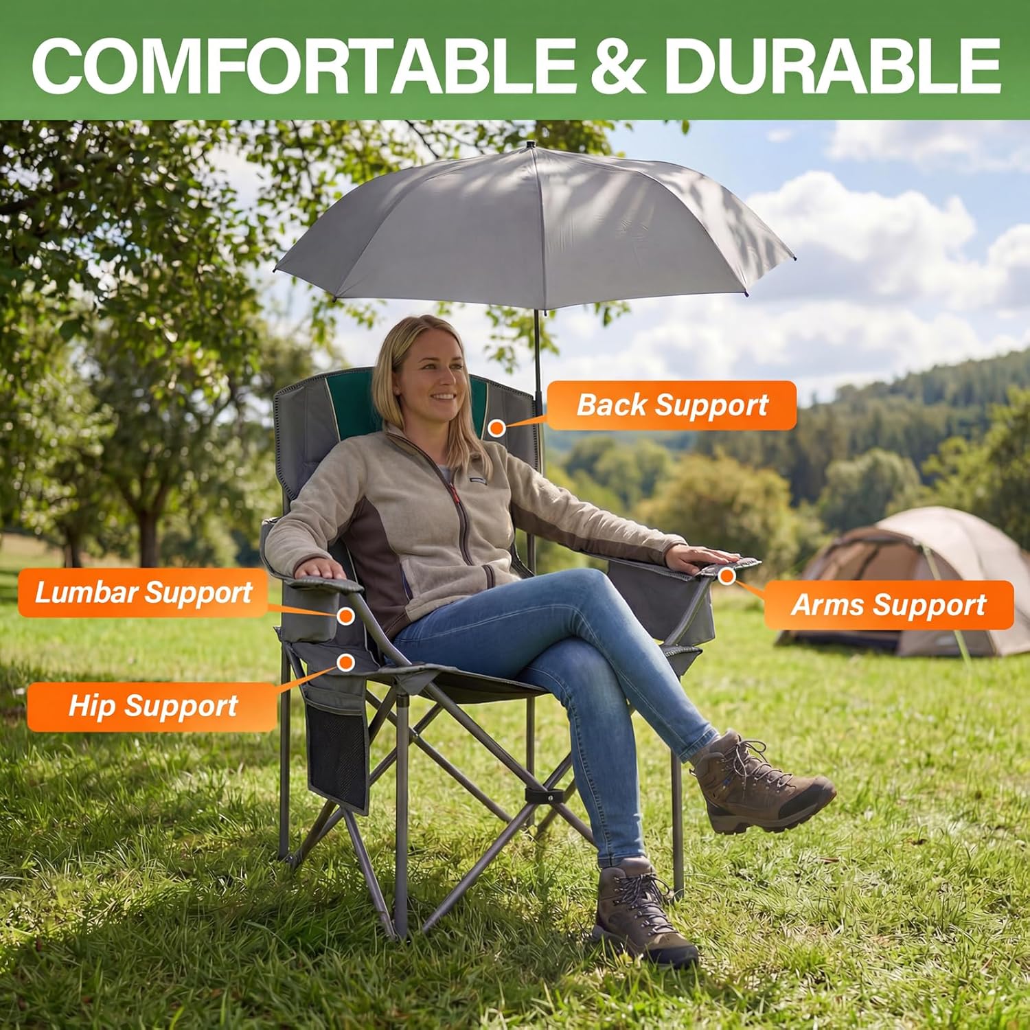 Upgrade your outdoor game with this 2-pack of oversized camping chairs in rich dark green. Each chair features an adjustable umbrella for custom shade, thick padded seating with solid backrest support, and cushioned armrests for serious lounging. Built with a heavy-duty steel frame that handles any terrain, these fold-up seats are ready for beach days, backyard BBQs, or picnic hangs. Just unfold, settle in, and stay comfortable wherever your weekend takes you.
